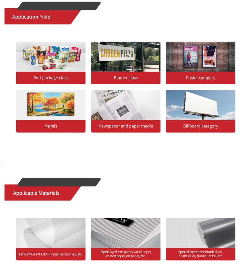 2. Wide color gamut printing, wide coverage, can be applied to printing signs, banners, posters, exhibition graphics, wallpapers, murals, fine craft graphics, billboards and so on.